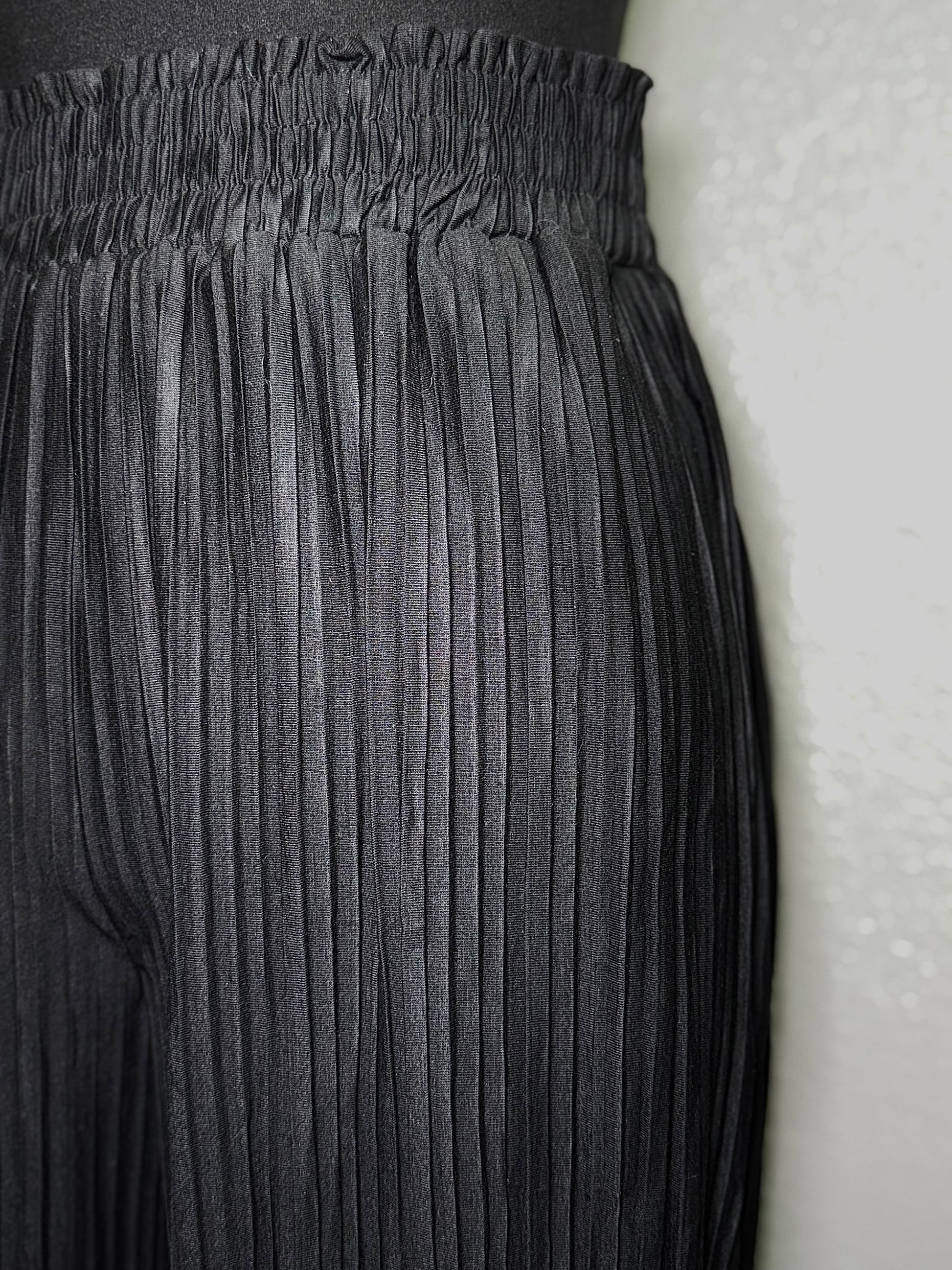Solid Wide Leg Pleated Pants showcase a high-waisted silhouette with an elastic waistband accented by a ruffle detail. They include functional side pockets and a raw edge finish.